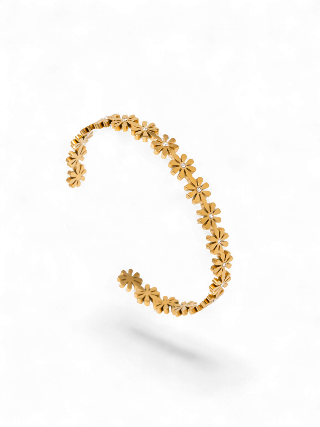 This 18K gold-plated stainless steel bangle is a charming ode to femininity and joy. Designed with a row of dainty daisy motifs, each petal shines with a polished golden finish and subtle crystal accents at the center. Lightweight yet durable, it’s hypoallergenic, waterproof, and sweat-proof — perfect for all-day comfort and elegance. Advanced PVD coating ensures lasting brilliance for up to 2–3 years, maintaining its fresh floral glow season after season.