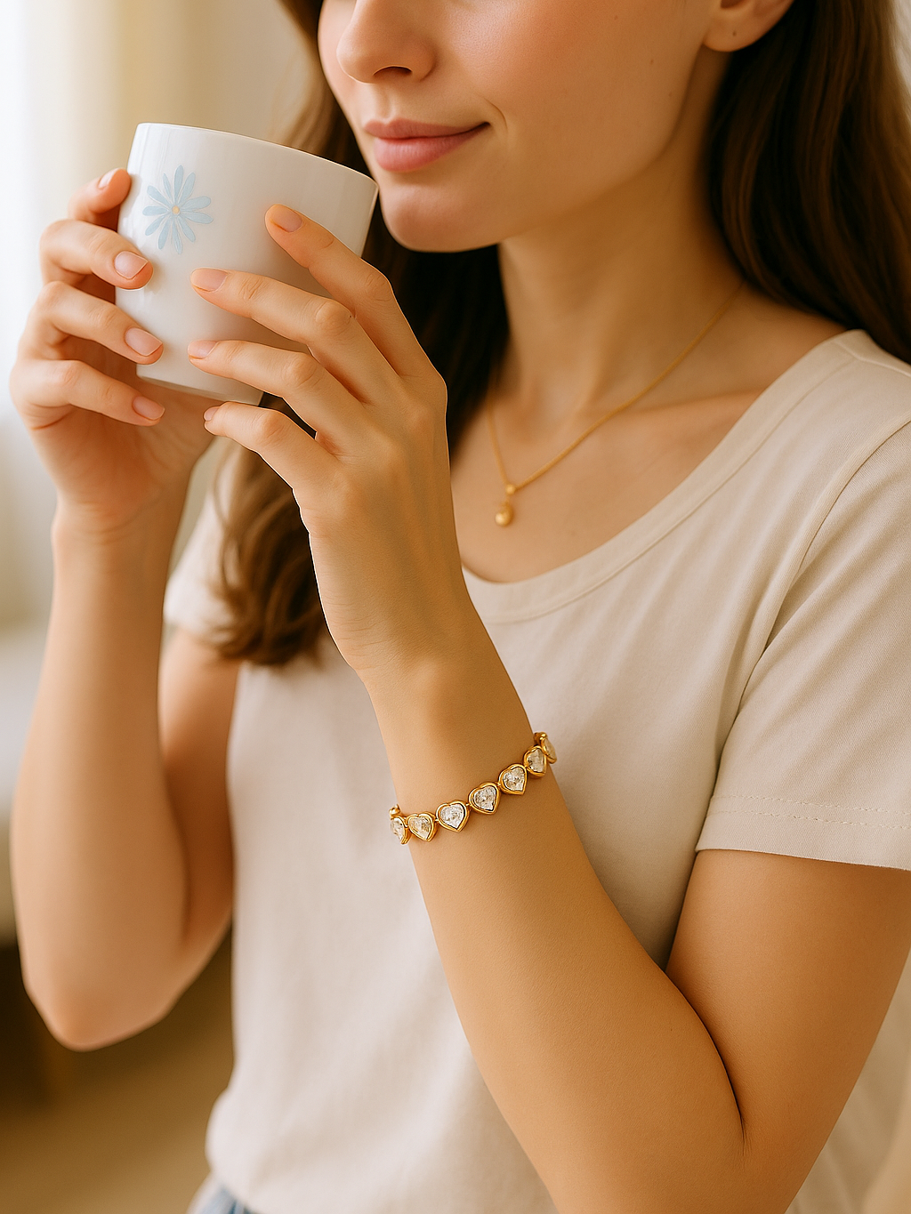 This 18K gold plated bracelet exudes romance and elegance with its row of heart-shaped links adorned with sparkling cubic zirconia stones. Lightweight yet durable, it is hypoallergenic, waterproof, and sweat-proof, making it perfect for all-day wear. The advanced PVD plating ensures its radiant gold finish stays vibrant for years, while the secure clasp guarantees a comfortable fit. A flawless blend of luxury and charm, it’s a timeless piece for both everyday style and special occasions.