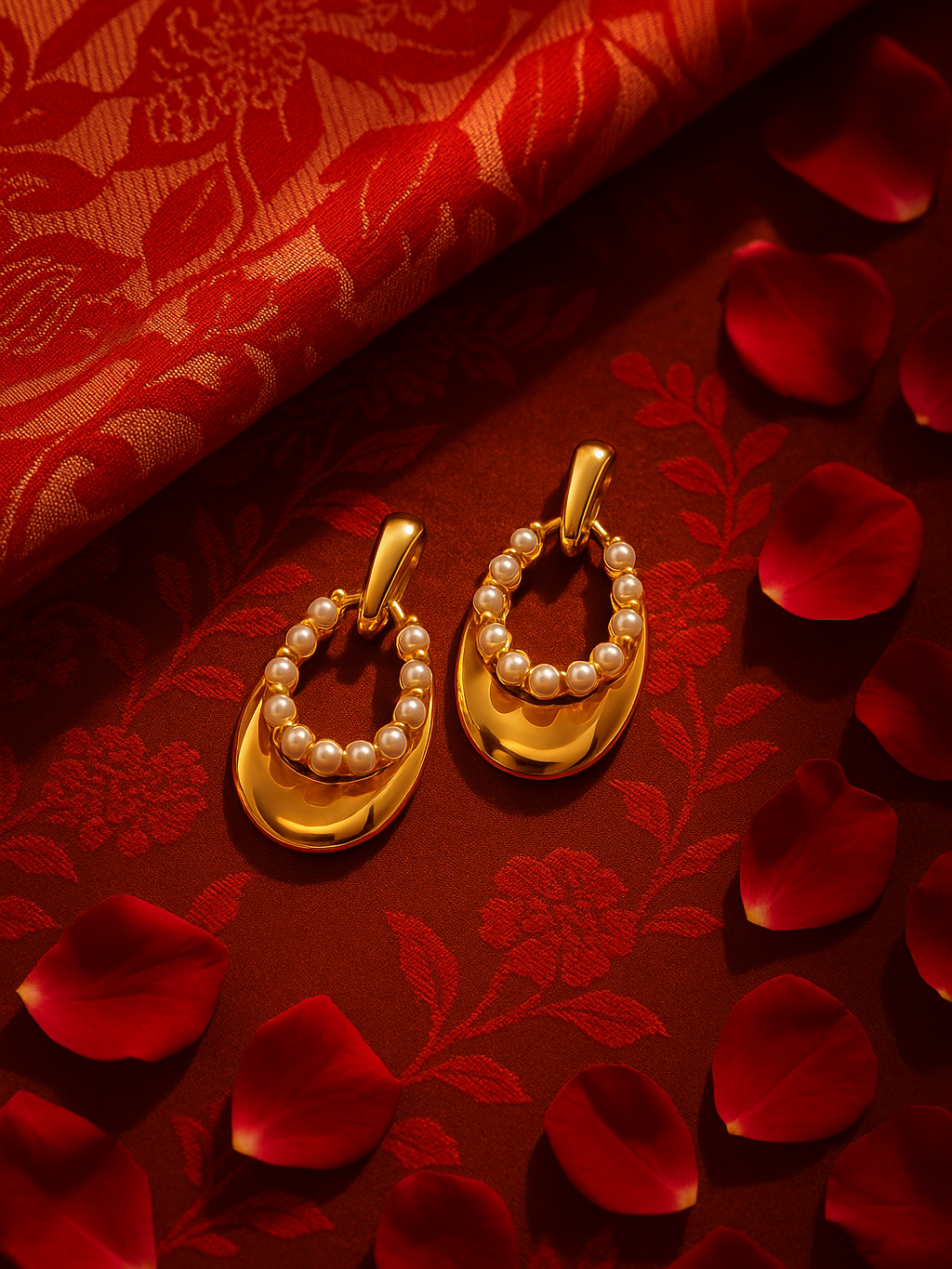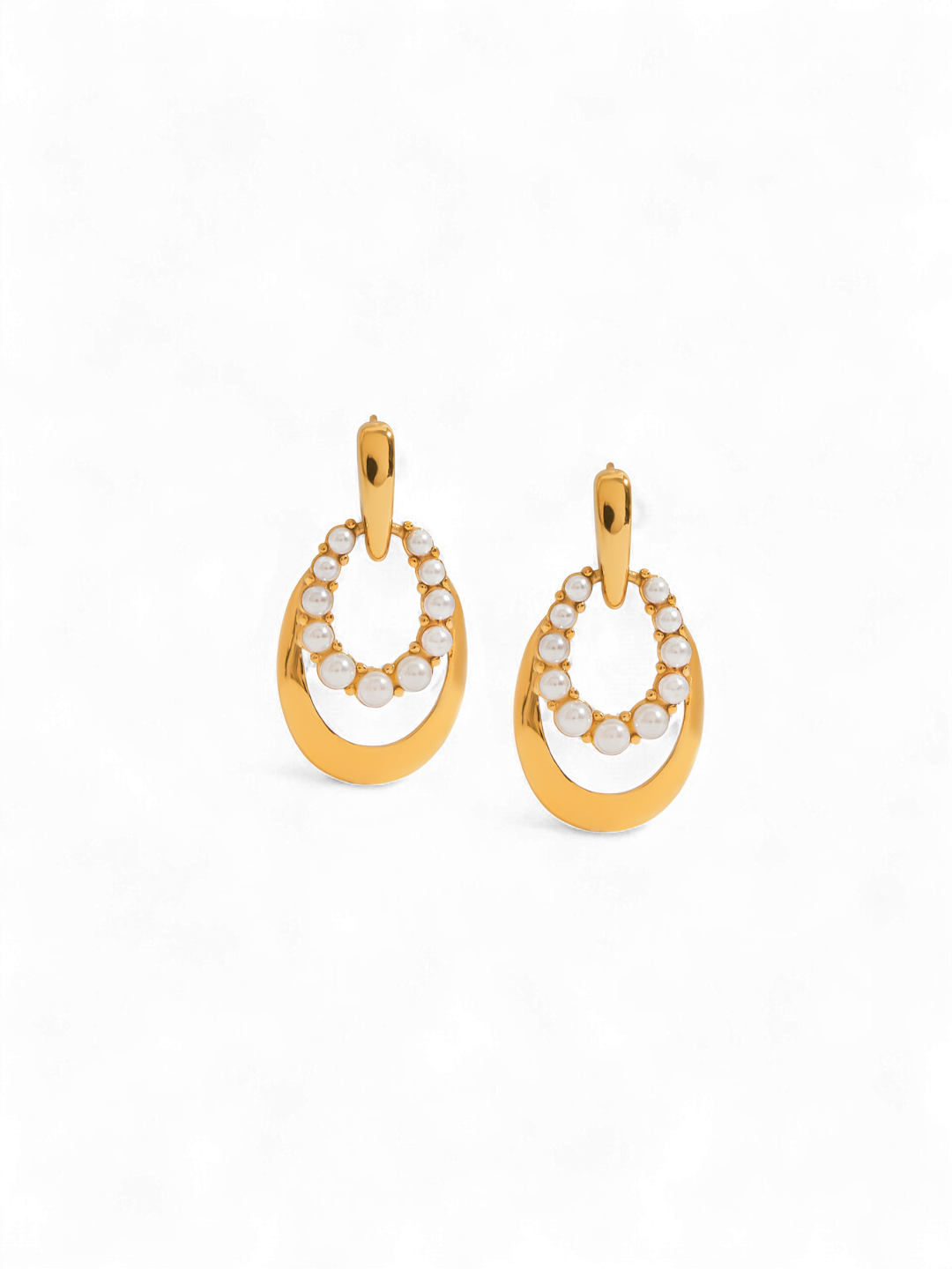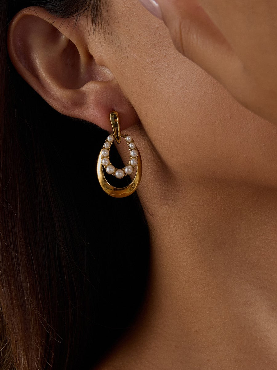 Crafted in 18K gold-plated stainless steel, these earrings feature an elegant semi-hoop design adorned with luminous faux pearls along the inner curve. The smooth gold surface and symmetrical pearl placement add a refined balance between modern minimalism and classic luxury. Hypoallergenic, waterproof, and tarnish-resistant, they’re built for long-lasting brilliance — perfect for both everyday wear and special occasions.