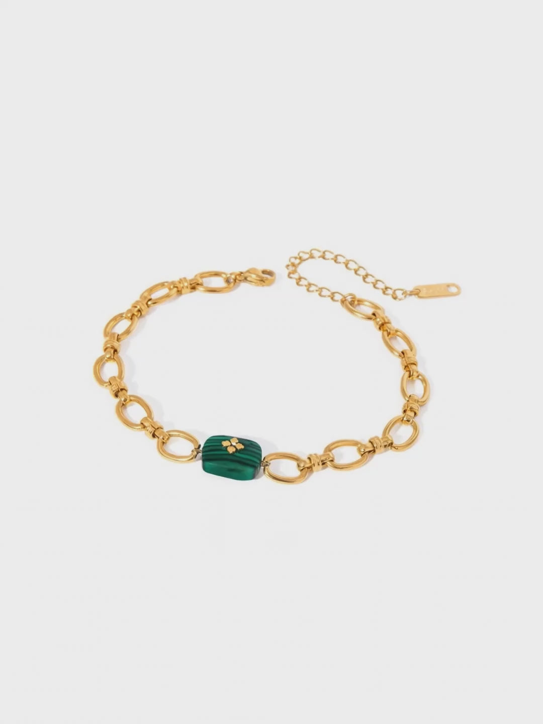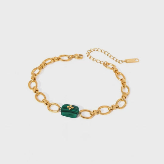 Crafted in 18K gold-plated stainless steel, this malachite stone bracelet blends natural charm with modern elegance. Hypoallergenic, waterproof, and sweat proof, it is designed for all-day comfort and worry-free wear. Advanced PVD plating preserves its rich golden finish for up to 2–3 years. Lightweight, durable, and beautifully polished, it adds a refined pop of color to every outfit – the perfect piece of effortless everyday luxury.