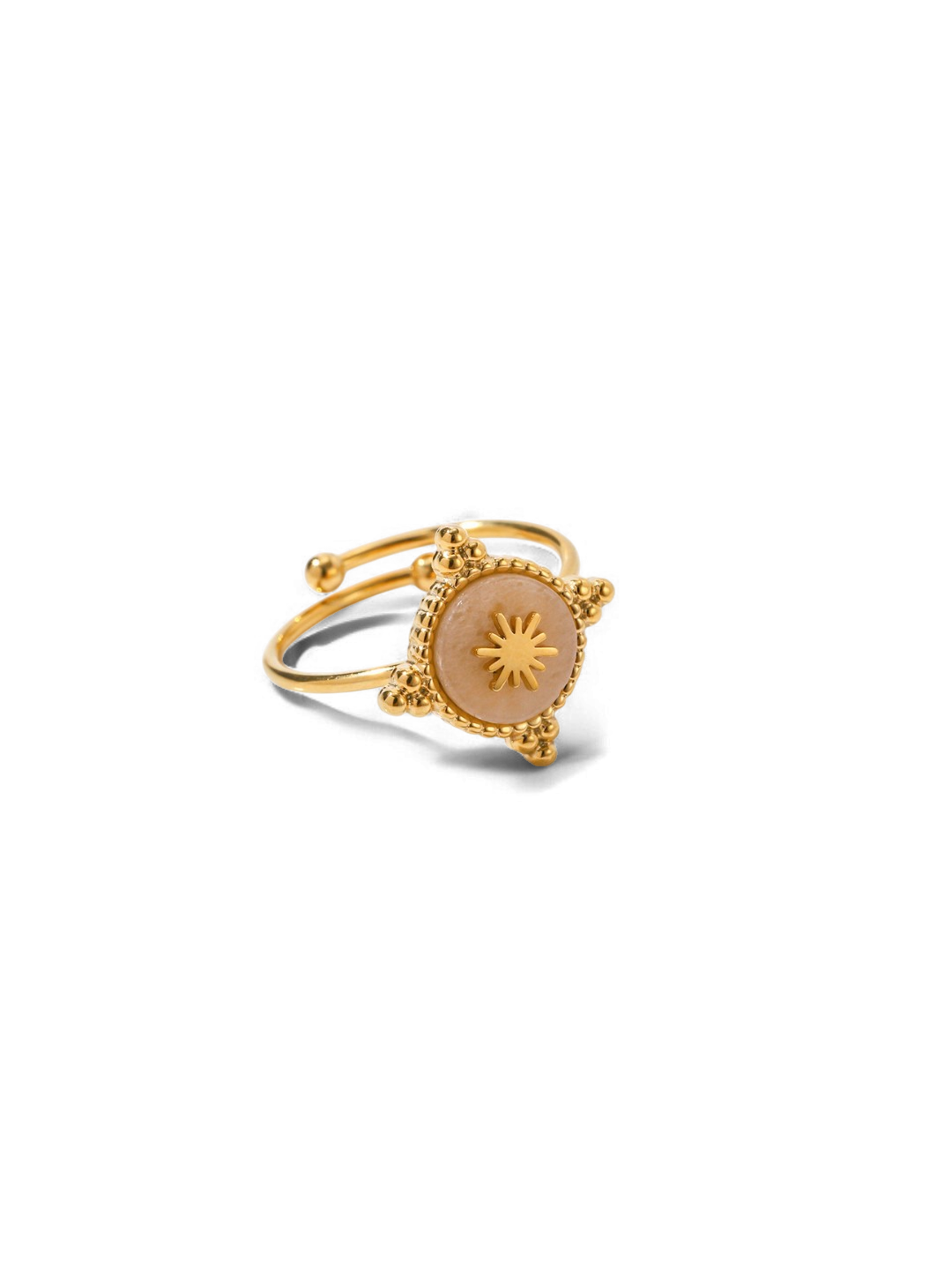 This 18K gold plated ring features a captivating sunburst design set against a smooth, round stone centerpiece, blending celestial charm with modern elegance. Its open adjustable band ensures a comfortable fit, while the hypoallergenic, waterproof, and sweat-proof build makes it ideal for everyday wear.